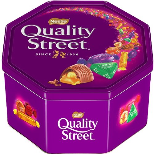 Smakfullt utvalg av individuelt pakkede praliner. En mix av farger og sjokoladepraliner. Quality Street er originalen fra 1936. Leveres i blikkboks på 2,9 kg.
