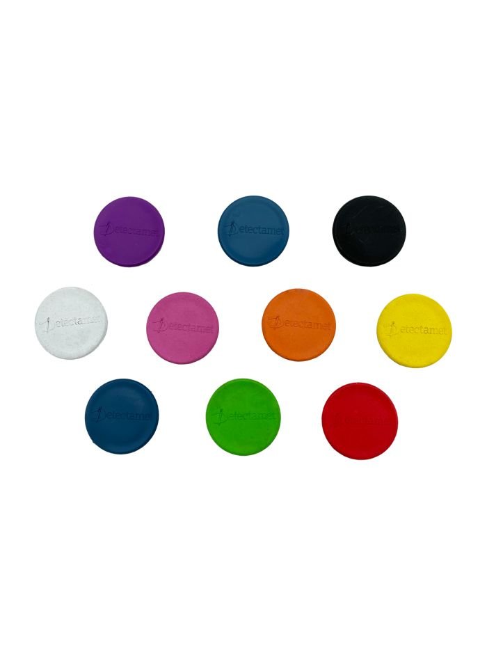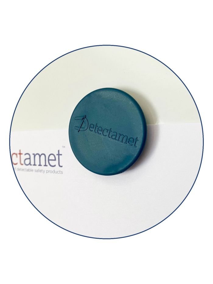 Sterke, matsikre metall- og røntgendetekterbare magneter. Perfekt for ferromagnetiske metalloverflater og tavler, med detekterbar polymer som omslutter en magnetisk skive.