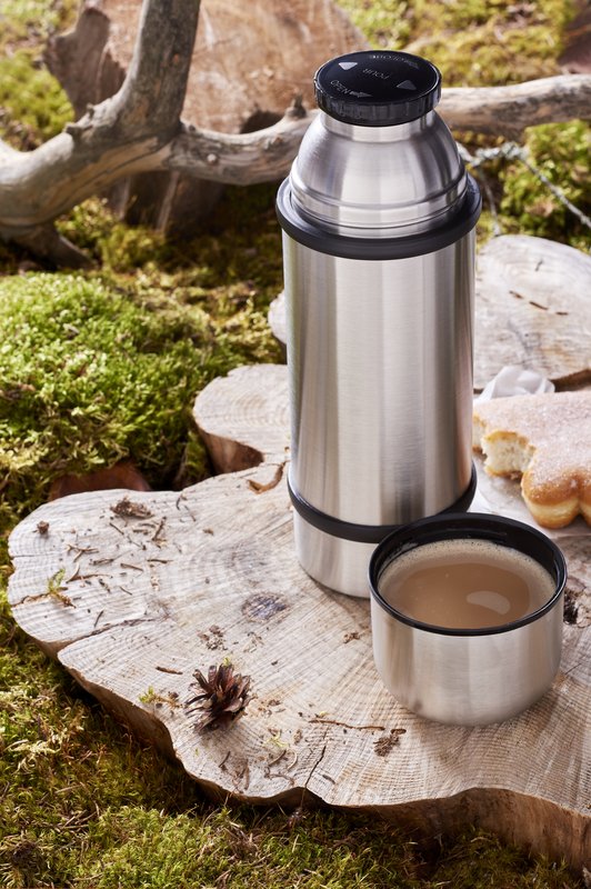Holder drinken varm om vinteren og kald om sommeren. Laget av rustfritt stål. Lokket fungerer også som krus.