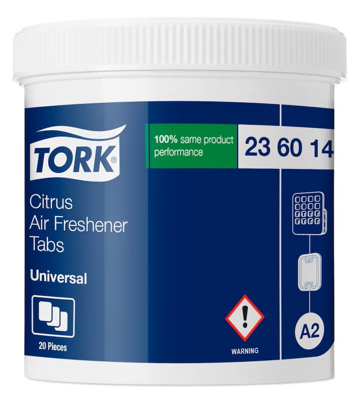 Gi toalettet et friskt duft med Tork Airfreshener Duftplater. Den impregnerte gummiplaten kan plasseres på alle steder der det er behov og gir en frisk sitrusduft.