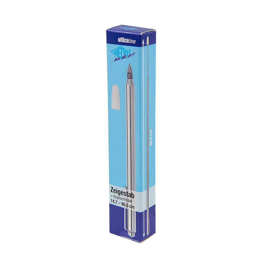 Teleskopisk pekepenn som kan forlenges til 90 cm. Med klips og standard kulepennrefill. Leveres på blisterkort. Dimensjoner: lengde: 14,7 cm