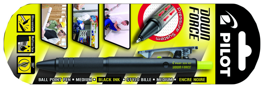 Down Force er en kulespisspenn for tøffe miljøer! Den skriver på de fleste underlag, også under fuktige forhold. Pennen kan skrives med i 360° og består av plast som tåler slag. Klipsen kan brukes 100000 ganger og pennen har et hull for å kunne henges i et kjede eller et hull.