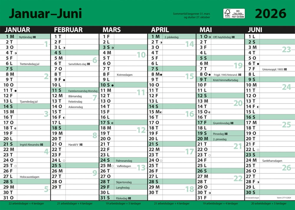 7.sans Kontorkalendere er en kalender som brukes ofte av mange. Ett halvt år pr side, gir en enkel og god oversikt. Alle er like enkle å bruke. Alle er enkle å ta med. Leveres i stiv kartong for ekstra holdbarhet.