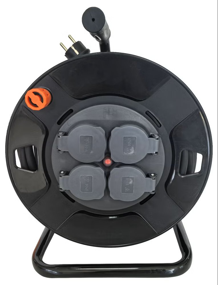 Kabeltrommel med fire jordede stikkontakter med deksel. Overbelastningsbeskyttelse. Gummikabel H07RN-F 3G1,5 mm². Godkjent for utendørs bruk. IP44.