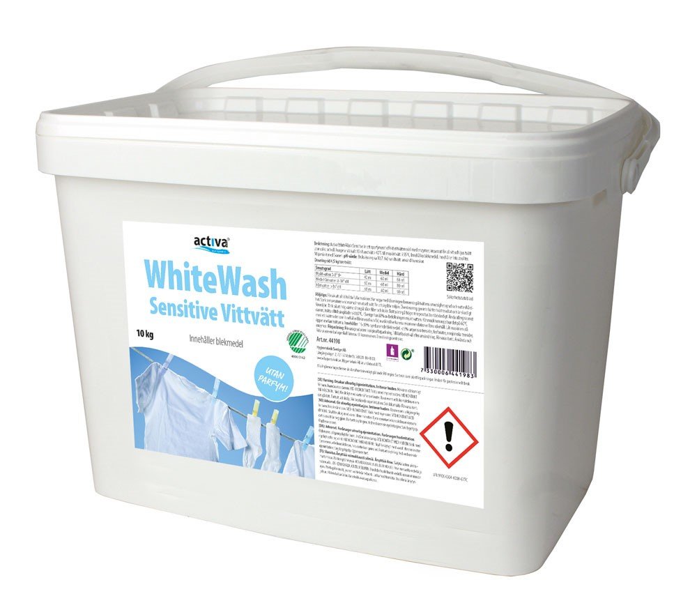 Activa WhiteWash Sensitive er et uparfymert, effektivt vaskemiddel med enzymer, egnet for alt hvitt og lyst tøy unntatt silke og ull. Fungerer godt i alt fra håndvask på 40°C til maskinvask på 95°C. Inneholder blekemiddel. Inneholder ikke zeolitter. Miljømerket med Svanemerket.
