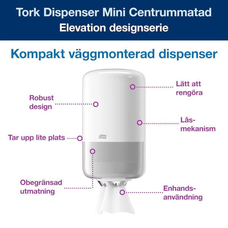 Tork® Dispenser Mini Senterrull i Elevation Design er en kompakt, allsidig løsning for profesjonelle miljøer, der tørking av både hender og overflater er nødvendig. Den ubegrensede tilgangen på papiret lar deg ta akkurat så mye papir som oppgaven krever, slik at du kan tørke overflater raskt. Elevation-dispenserne har en funksjonell og moderne design.