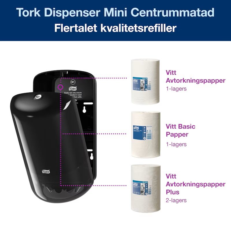 Tork® Dispenser Mini Senterrull i Elevation Design er en kompakt, allsidig løsning for profesjonelle miljøer, der tørking av både hender og overflater er nødvendig. Den ubegrensede tilgangen på papiret lar deg ta akkurat så mye papir som oppgaven krever, slik at du kan tørke overflater raskt. Elevation-dispenserne har en funksjonell og moderne design.