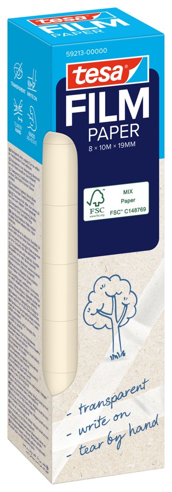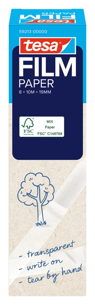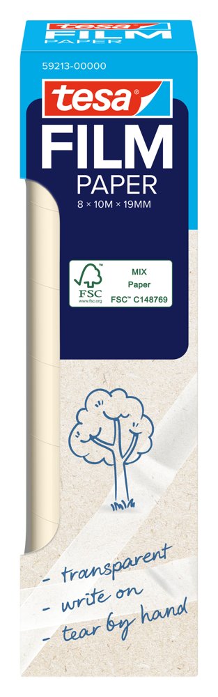 Et bæredygtigt produkt: Den transparente tape tesafilm® Paper har et bæremateriale af papir. Den er meget alsidig og er dermed den perfekte makker i hjemmet, på kontoret og i skolen. Tapen kan skrives på og er næsten usynlig på lyse overflader som eksempelvis papir.