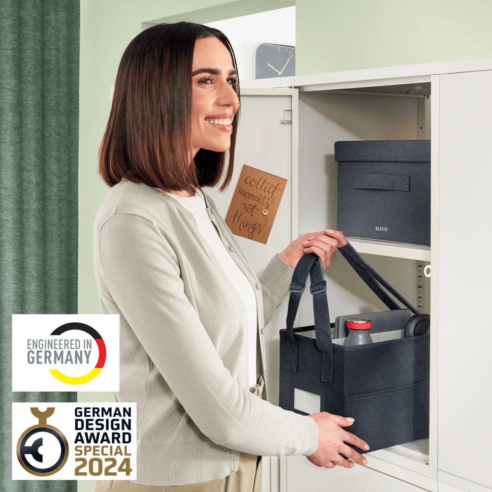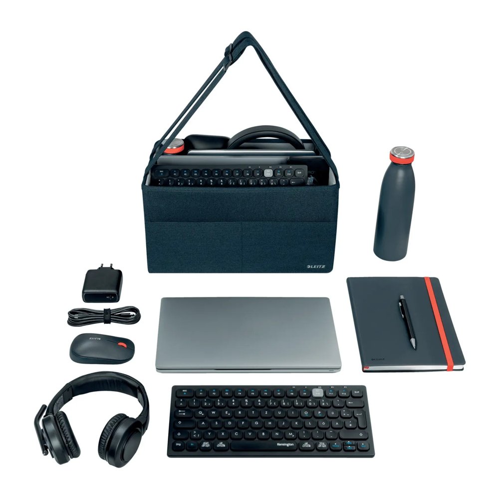 Føl deg hjemme uansett hvor dagen tar deg med Fabric Storage-serien fra Leitz. Med sitt minimalistiske design og innbydende mattgrå farge kan du holde orden på kontoret, hjemme, på hybridarbeidsplassen og alle andre steder på en elegant måte. Leitz Compact Office-In-A-Bag har tre separate rom som gjør at du kan oppbevare og bære med deg alt du trenger for dagen. Denne moderne og praktiske oppbevaringsvesken har plass til en bærbar PC (opptil 14''), et kompakt tastatur, en mus, en ladekabel, et headset, en notatbok og en vannflaske. Den passer i skap med minimumsmål på 370 x 210 mm og en høyde på 220 mm. Også egnet som lærerveske. Laget av mykt materiale forsterket med resirkulert papp for styrke og holdbarhet. Totalt 57 % resirkulert materiale. Når den ikke er i bruk, kan den enkelt brettes sammen for praktisk oppbevaring. Navneskiltet som følger med vesken gjør det enkelt å identifisere den i fellesarealer. Denne skrivebordsvesken, med justerbart bærehåndtak, er et flott tilskudd til hjemmet, kontoret eller skolen, og sørger for at du enkelt kan bære med deg dine eiendeler og være produktiv gjennom hele dagen.