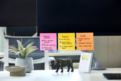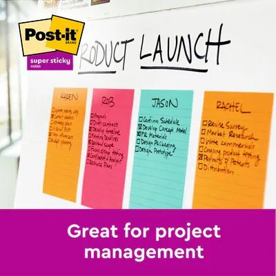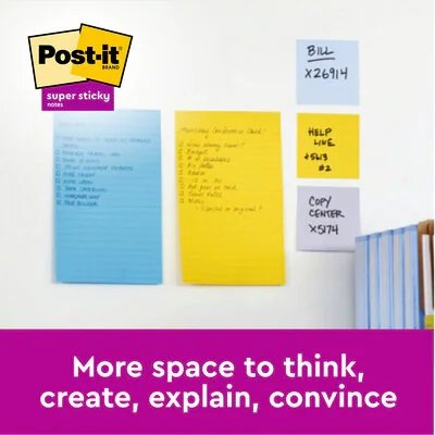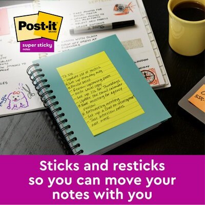 Store Post-it® Super Sticky Notes har sterkere feste og varer lenger. De har dobbel så sterk klebeevne sammenlignet med de originale Post-it® Notes, slik at du kan være helt sikker på at beskjeden din kommer frem. Disse store, fargede selvklebende lappene er perfekte for vertikale overflater og overflater det er vanskelig å feste ting på. I tillegg er de linjerte og perfekte til å skrive ned flere notater eller legge igjen lange beskjeder og påminnelser. De er supersterke, ekstremt allsidige og designet for at beskjedene dine skal skille seg ut.
