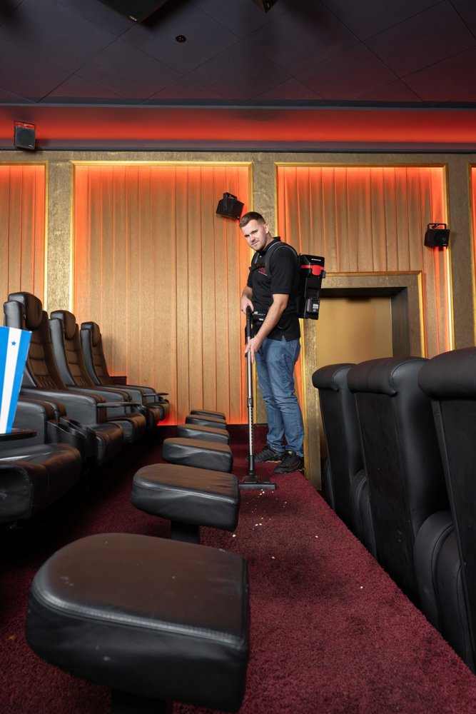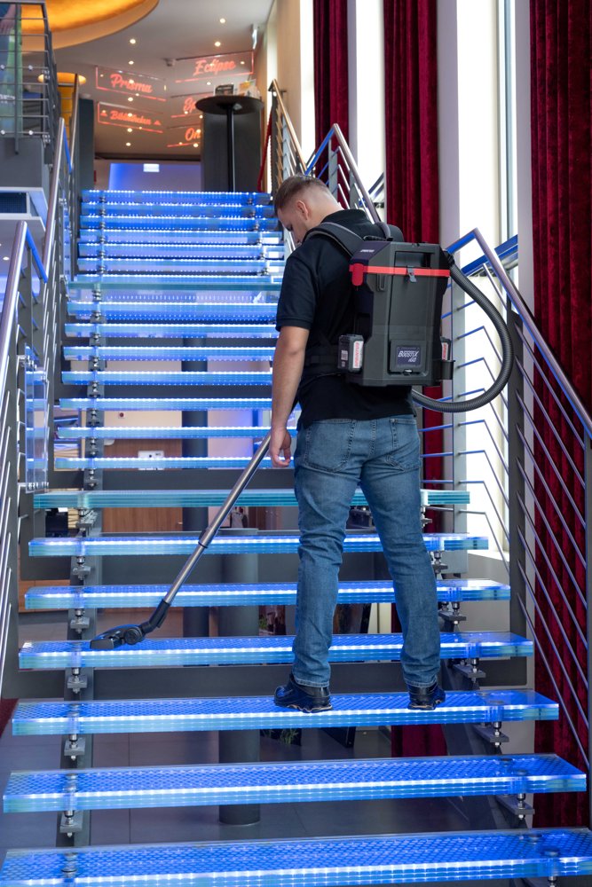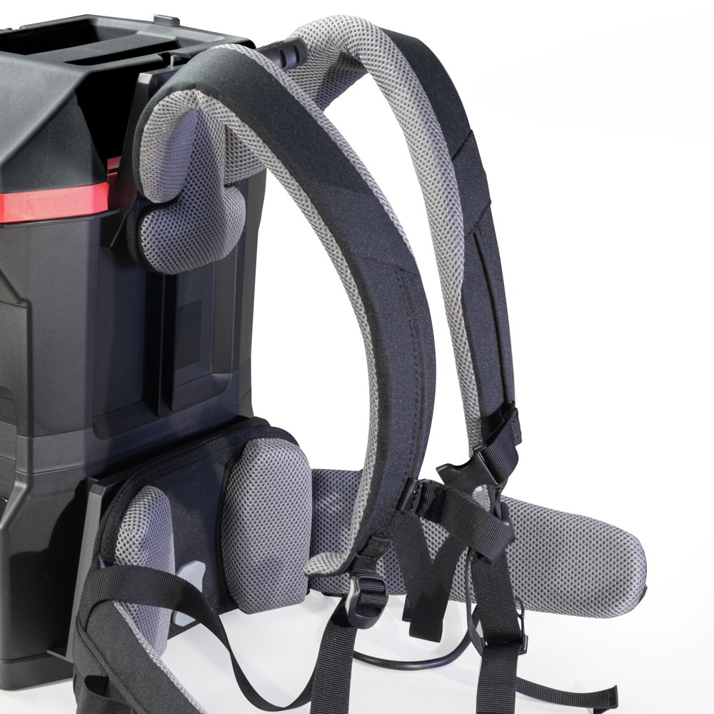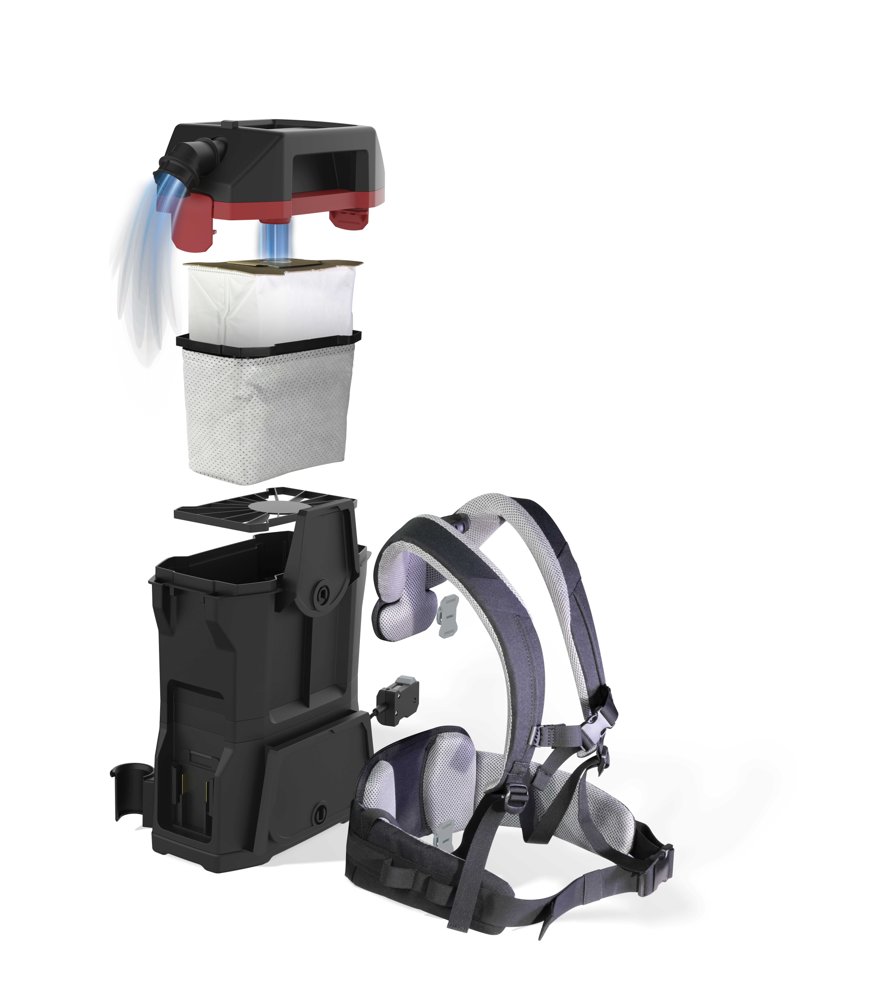 Batteridrevet ryggstøvsuger perfekt for trange rom eller der 220 volt ikke er tilgjengelig. Ergonomisk bæresele med justerbare og kraftig polstrede hofte- og skulderstropper og bryststropp gir svært høy komfort og muliggjør lange arbeidsskift. Bæresystemet er utformet slik at luften kan sirkulere mellom maskinen og brukerens rygg for å unngå varmeoppbygging. Kontrollenheten for støvsugeren er plassert på hoftebeltet for enkel betjening. Laget av 75 % resirkulert materiale.