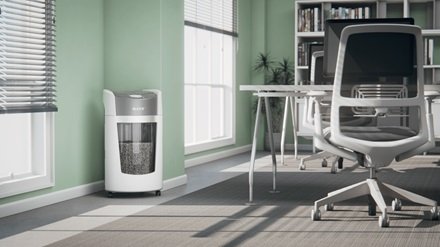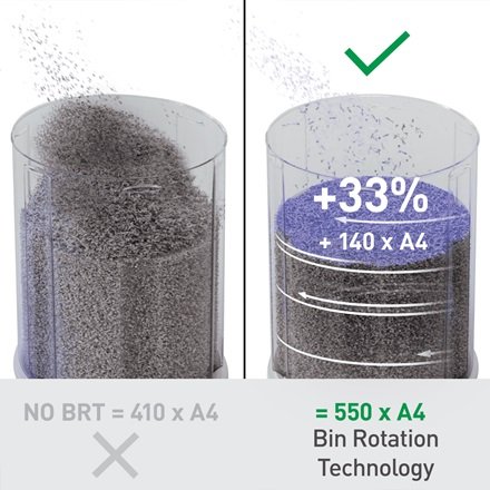 • Sjenerøs 35L beholderkapasitet, rommer opptil 550 stk. A4-ark før den må tømmes; +33 % bedre kapasitet sammenlignet med maskiner uten roterende beholder (+140 stk. A4-ark).