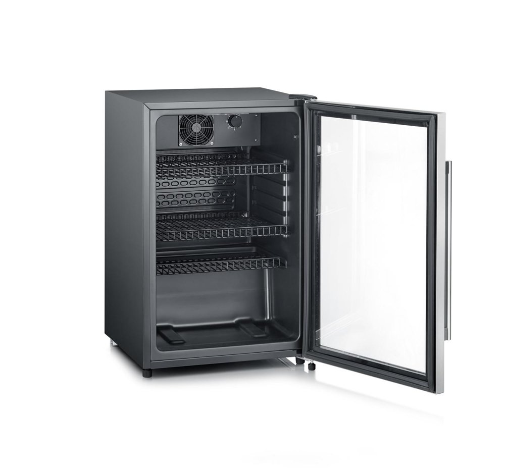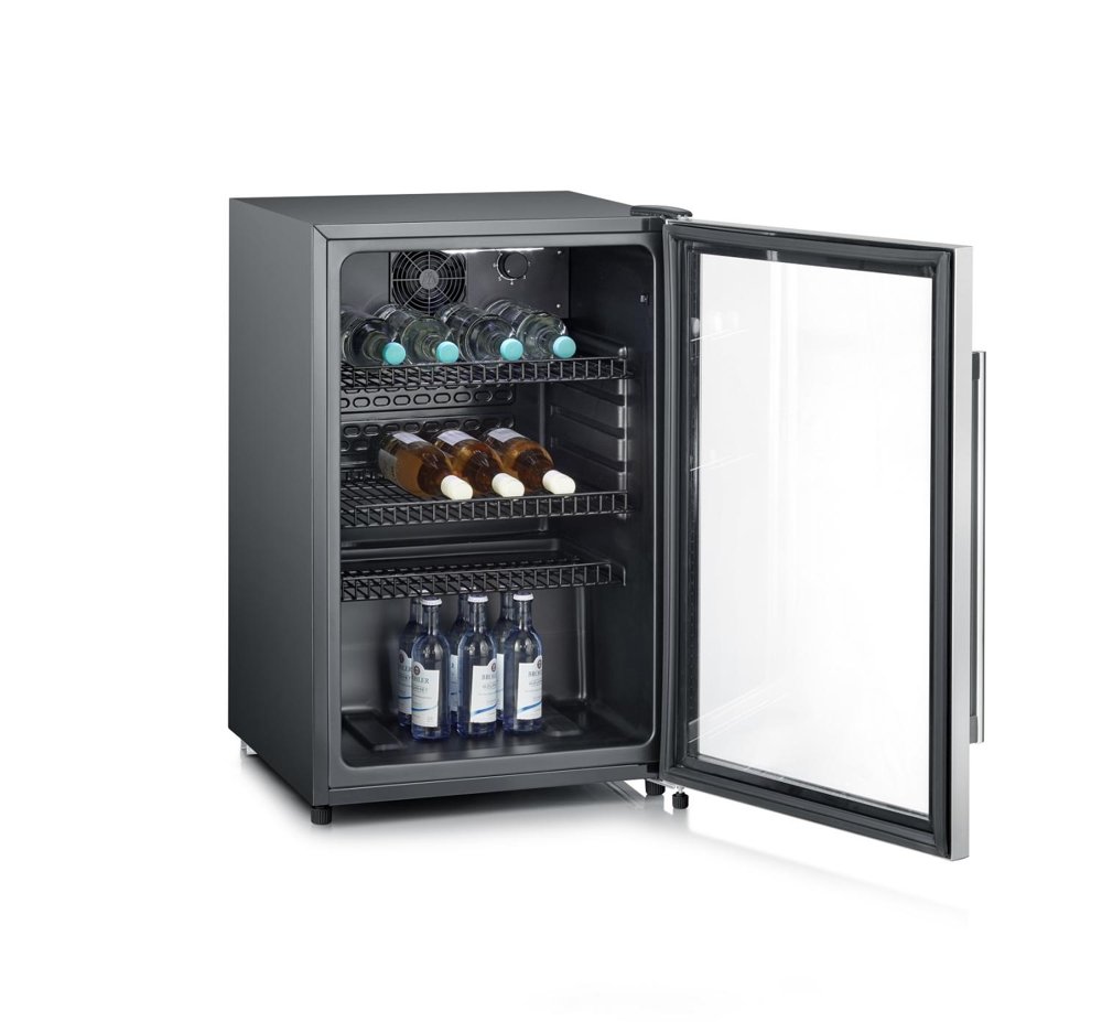 Svart kjøleskap med glassdør og trådhyller med plass til opptil 56 flasker (33cl) eller 42 flasker (50cl).