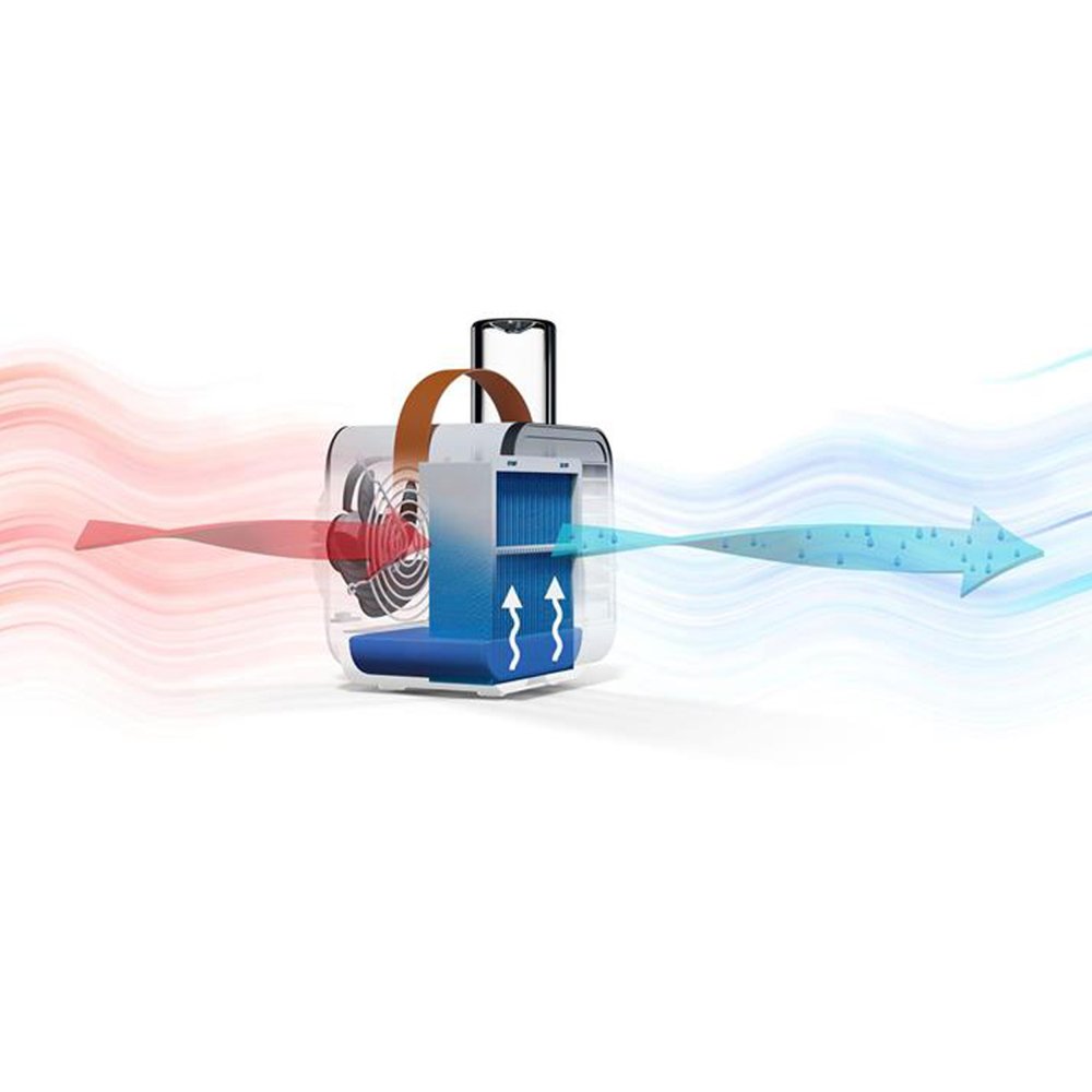Med det praktiske bærehåndtaket er bordviften alltid klar til bruk. Luftkjøling og luftfukting med en vifte og fordampningsprinsippet.