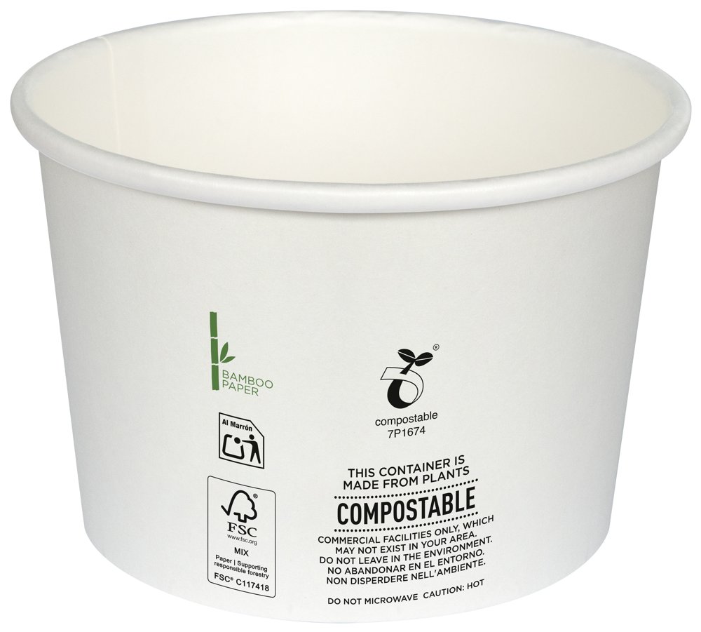 Laget av fornybare ressurser. Laget av papp med plantebasert PLA-belegg. Kan brukes til varm mat. Oppfyller EN 13432-standardene for komposterbarhet.
