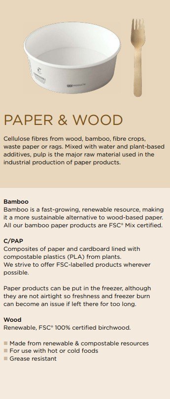 Laget av fornybare ressurser. Laget av papp med plantebasert PLA-belegg. Kan brukes til varm mat. Oppfyller EN 13432-standardene for komposterbarhet.