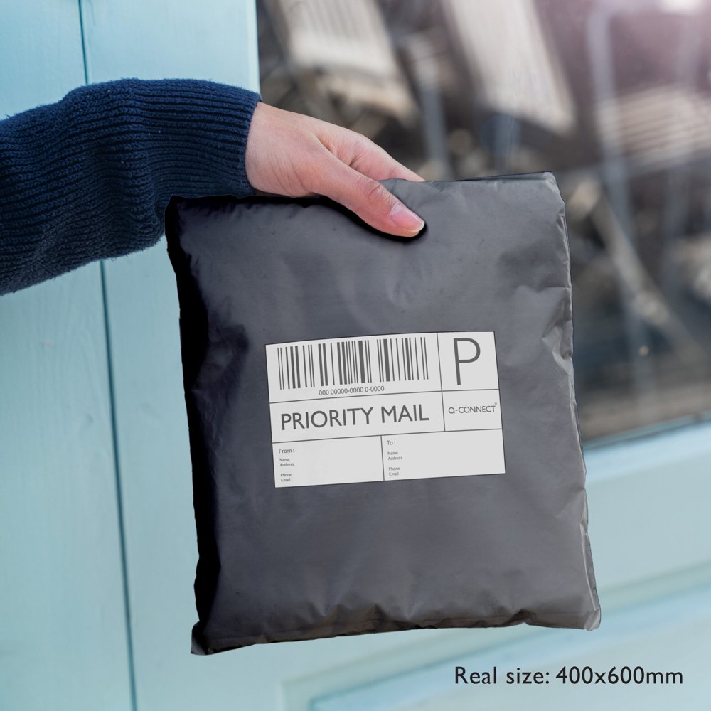 Q-Connect Svarte, ugjennomsiktige postposer, laget av 100 % resirkulert materiale. 3-lags slitesterk PE-film 50 mikron. Kurérposene er slitesterke, vanntette og motstandsdyktige mot rifter og punkteringer. De har en sterk selvklebende lukking med én stripe. Posens dimensjoner: 400 x 600 mm. Eske med 100 stk.