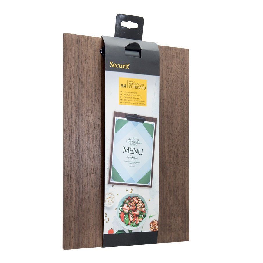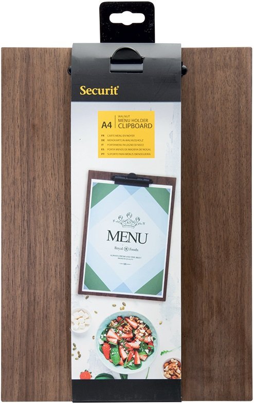 Menypermen Securit® A4 Walnut Clip Menu Holder er en tidløs klassiker med sine naturlige materialer av første klasse. Denne håndlagde menypermen laget av lakkert valnøtt finér, er et ideelt valg for moderne barer og restauranter som foretrekker et luksuriøst og naturlig utseende. Menypermen har presisjonskuttede, glatte kanter og en svart metallklype som gjør det enkelt å bytte ut menysidene.