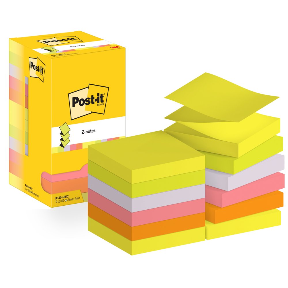 Notatblokk Post-it® Z-Notes neon farger 12 blokk 76x76mm
